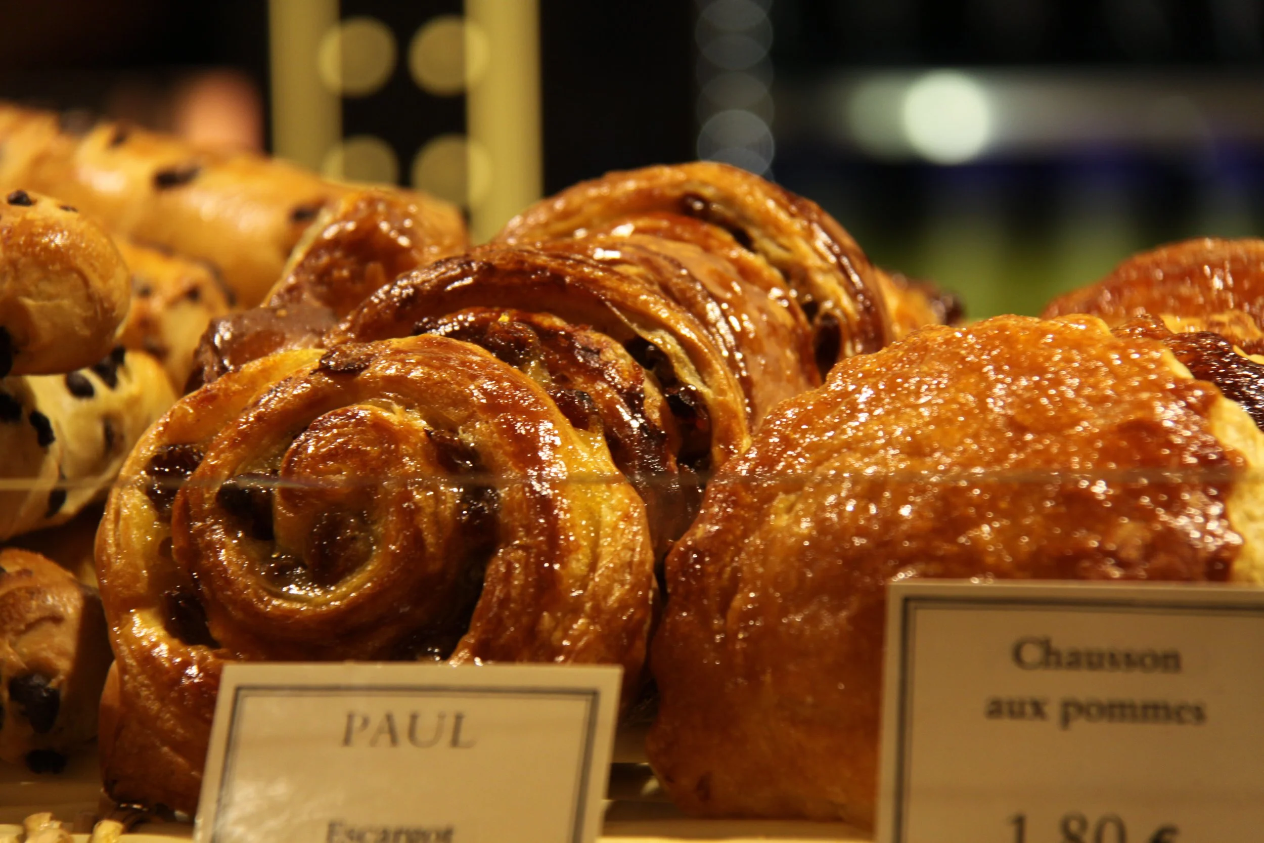 The glossy surface of the pastries reflects the warm bakery light, revealing delicate layers, caramelized edges, and soft curves. Displayed behind glass, they feel rich, inviting, and quietly indulgent in their careful arrangement.