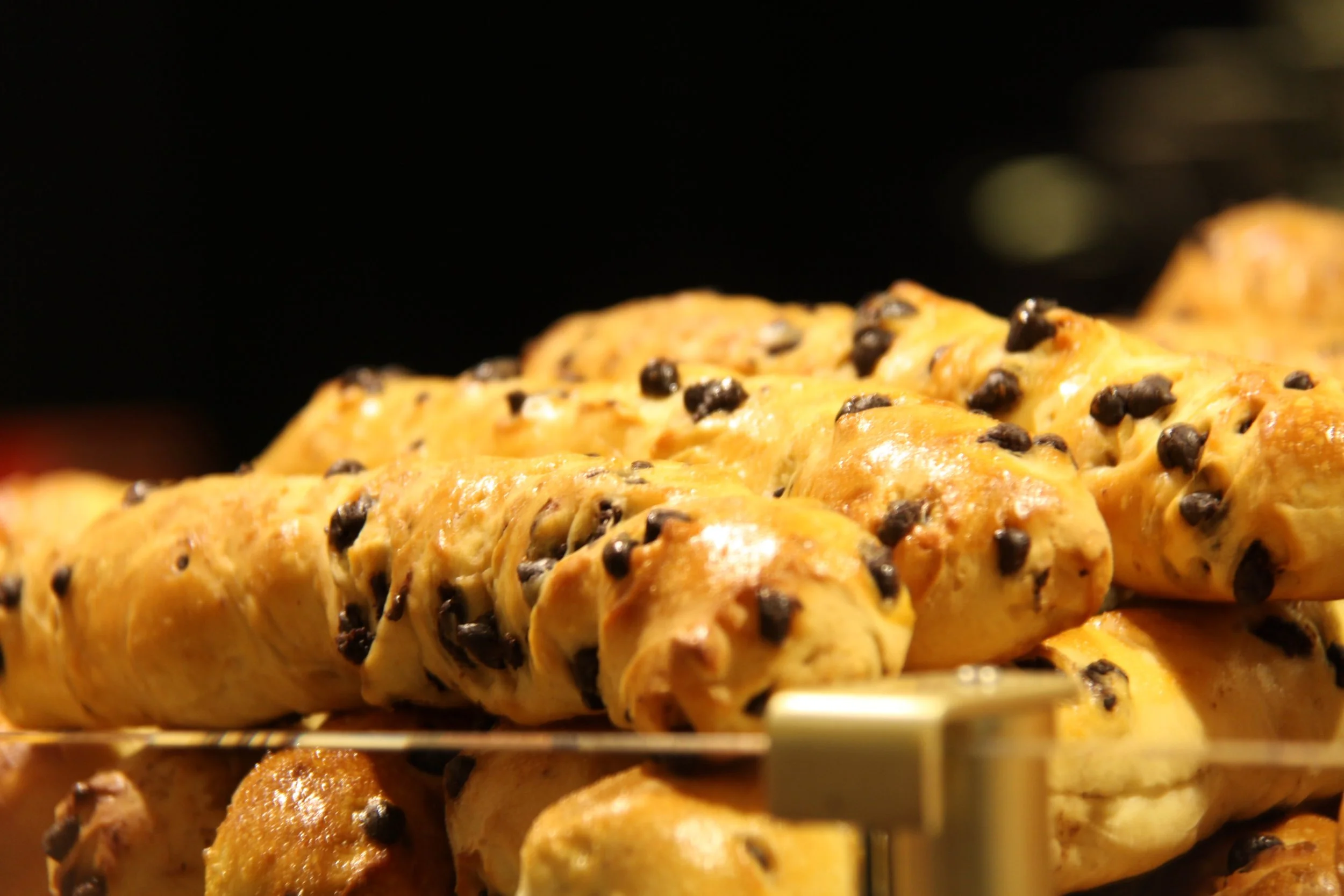 Rows of chocolate-studded rolls rest under warm light, their golden surfaces contrasting against the dark background. The shallow focus and close composition draw attention to texture, repetition, and the comforting simplicity of freshly baked bread.